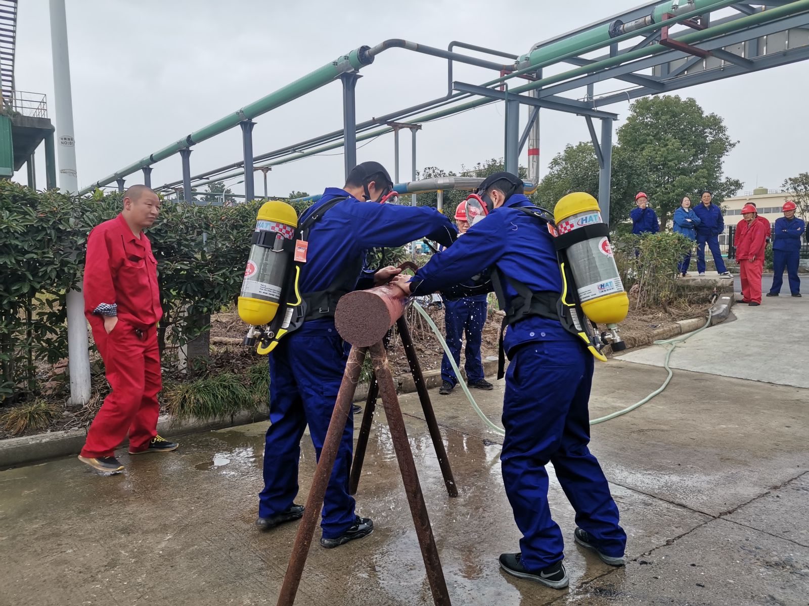 此次消防比武设有灭火、堵漏、水带三项,比赛5个代表队分别为电解车间、动力车间、氯车间、加氢车间、机关联队。赛制要求每个代表队人数不低于八人,三项项目,每一项项目随机抽取两人合作比赛,不得重复参赛。这种赛制要求我们的参赛队员要精通每一项比赛项目并且和其他七人都有充分的默契。