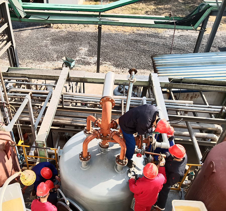 此次更换吊装空间小、管线复杂、精准度要求高,经过大家的共同努力和精心操作,在一天半时间内圆满完成了鳌合树脂塔更换任务。