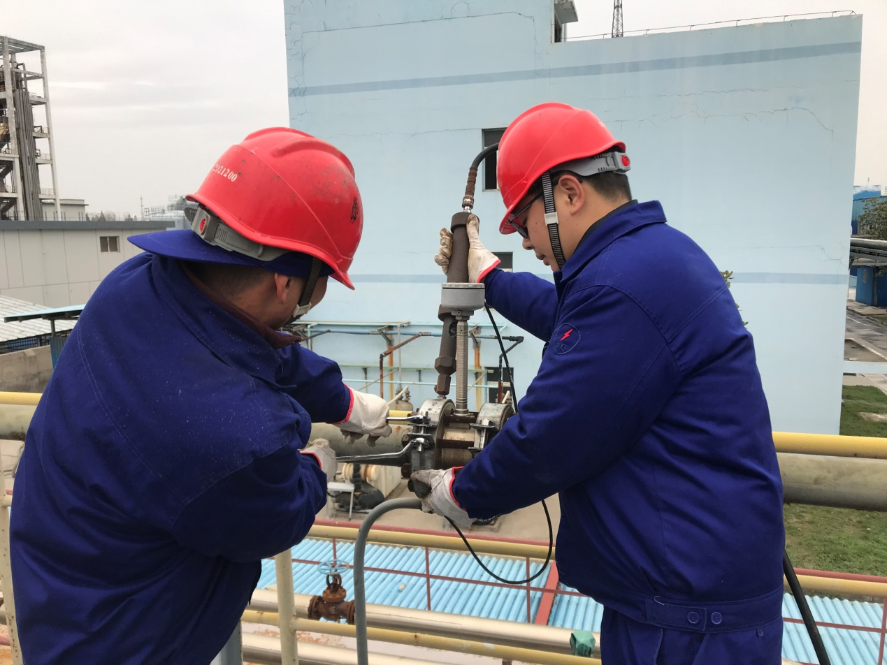 准备齐全后在生产总监刘年平、加氢车间主任李传勇的带领下,加氢车间堵漏抢险小组按计划前往漏点进行带压堵漏工作,首先在漏点法兰上安装好法兰夹,通过注剂枪往法兰夹里注射带压堵漏密封胶,完成密封后进行试漏,整个过程一气呵成。最终在不影响供气的情况下顺利完成了带压堵漏工作,保障了加氢生产线的供气安全。