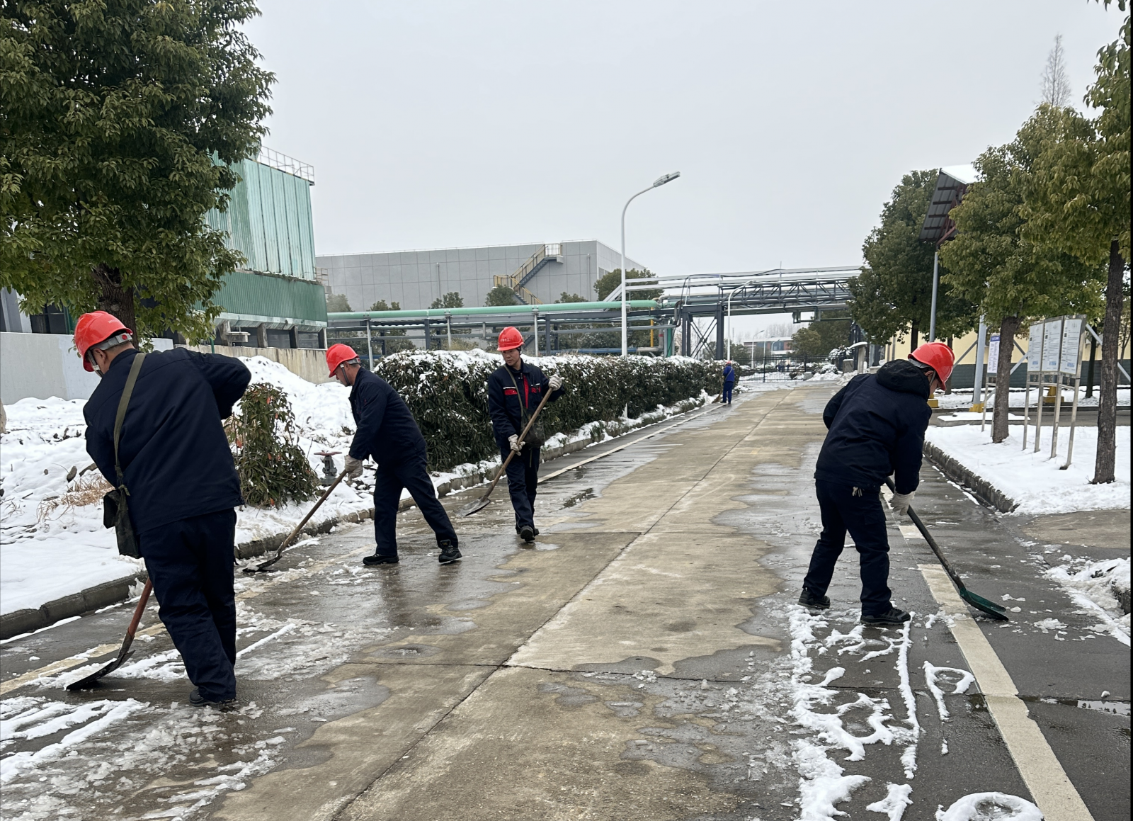 早在降雪前一天,生产部便第一时间发布《雨雪天气安全生产预警通知》,要求各岗位重点加强设备巡检频次与工艺参数监控精度。1月20日上午,各车间操作人员顶着风雪,对管道阀门、仪表线路开展专项排查,及时清理设备表面积雪与冰霜,重点检查保温层与紧急切断装置的运行状态,确保核心设备及管道在低温环境下稳定运行。同时,针对路面湿滑隐患,班组长带领员工迅速清扫作业通道,在巡检路线、应急通道等关键区域设置防滑警示标识,保障人员通行安全。